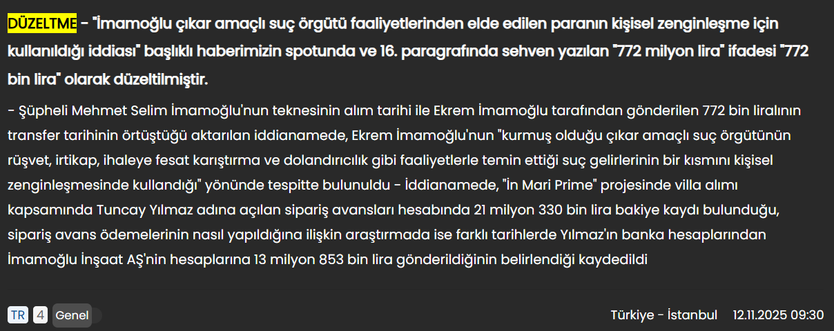 Anadolu Ajansı’ndan abonelere yönelik bilgilendirmede “İmamoğlu çıkar amaçlı suç örgütü faaliyetlerinden elde edilen paranın kişisel zenginleşme için kullanıldığı iddiası” başlıklı haberimizin spotunda ve 16. paragrafında sehven yazılan ‘772 milyon lira’ ifadesi ‘772 bin lira’ olarak düzeltilmiştir” ifadeleri yer aldı.
