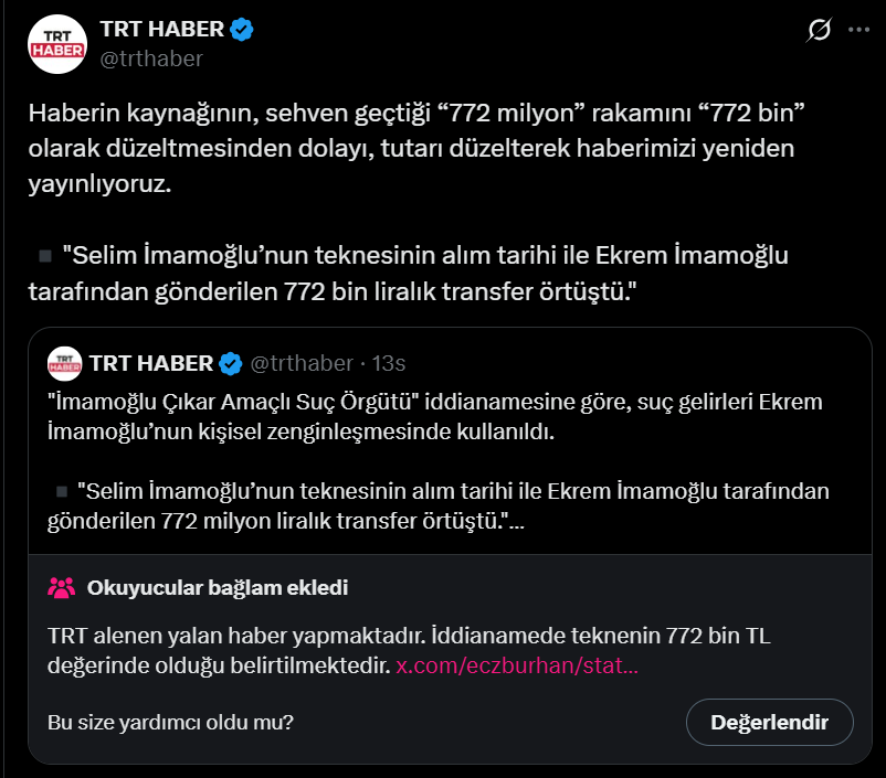 Ajansın geçtiği düzeltmenin ardından TRT Haber de söz konusu haber içeriğini değiştirdi ancak sosyal medya platformu X’te paylaştığı gönderide 772 milyon lira ibaresini uzun süre kaldırmadı.