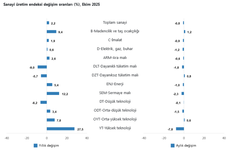 Buna göre sanayi üretimi ytıllık yüzde 2,2 arttı. Alt sektörlere göre; 2025 yılı Ekim ayında madencilik ve taş ocakçılığı sektörü endeksi bir önceki yılın aynı ayına göre yüzde 9,4 arttı, imalat sanayi sektörü endeksi yüzde 1,9 arttı ve elektrik, gaz, buhar ve iklimlendirme üretimi ve dağıtımı sektörü endeksi yüzde 0,6 arttı.