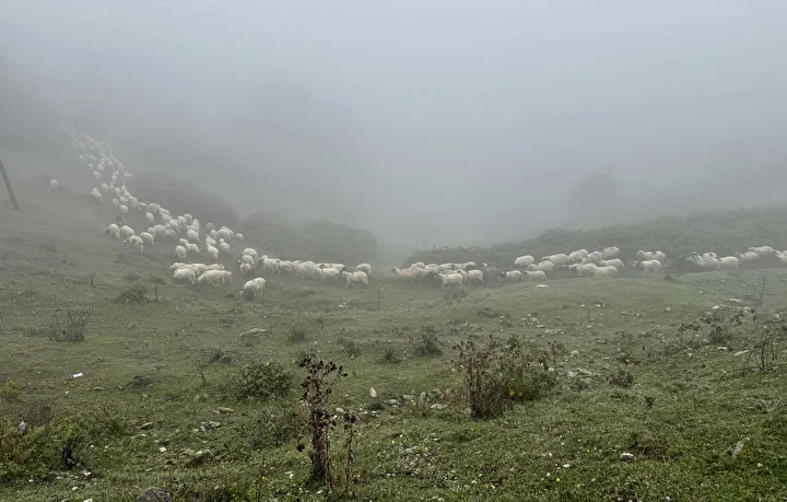 Karagöl Yaylası’ndan sabahın erken saatlerinde sürüsüyle yola çıktıklarını dile getiren Büber, “Akşam Çambaşı Yaylası’nda kaldık. Şimdi yavaş yavaş duman ve çise eşliğinde gidiyoruz. Yolculuk zor geçiyor. Yürüyorsun, koyunu takip etmek gerekiyor. Duman, çise, tam ayı ve kurt havası. Onun için zor.” dedi.