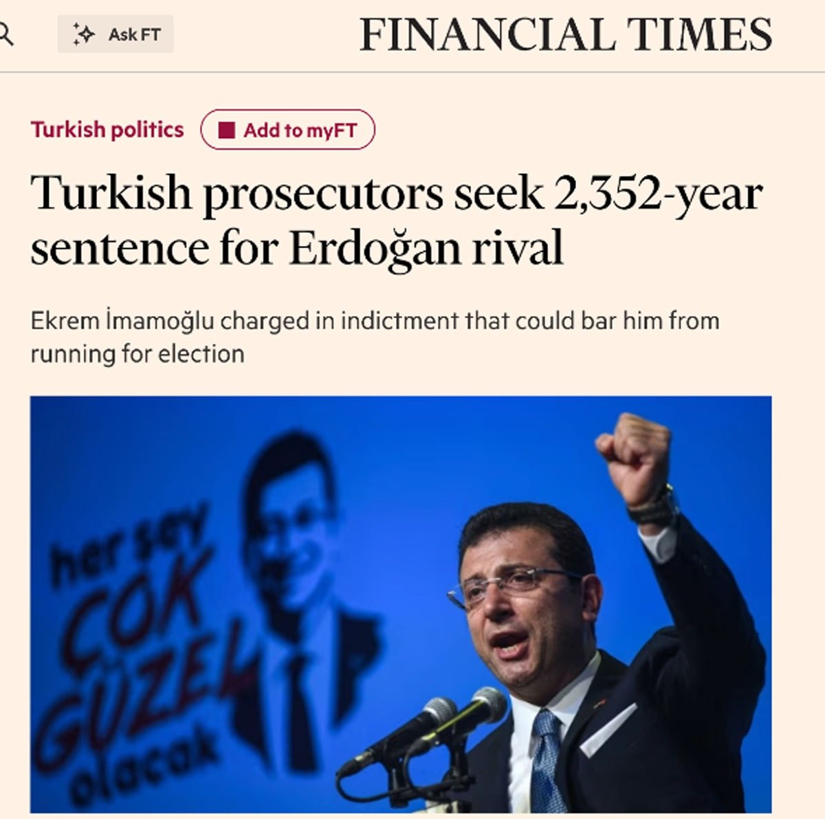 FINANCIAL TIMES: İddianameyi “İmamoğlu’nun siyasetten tamamen dışlanmasını amaçlayan bir süreç” olarak değerlendirdi. Gazete, 160 milyar TL kamu zararı iddiasını olağan dışı olarak nitelendirdi.